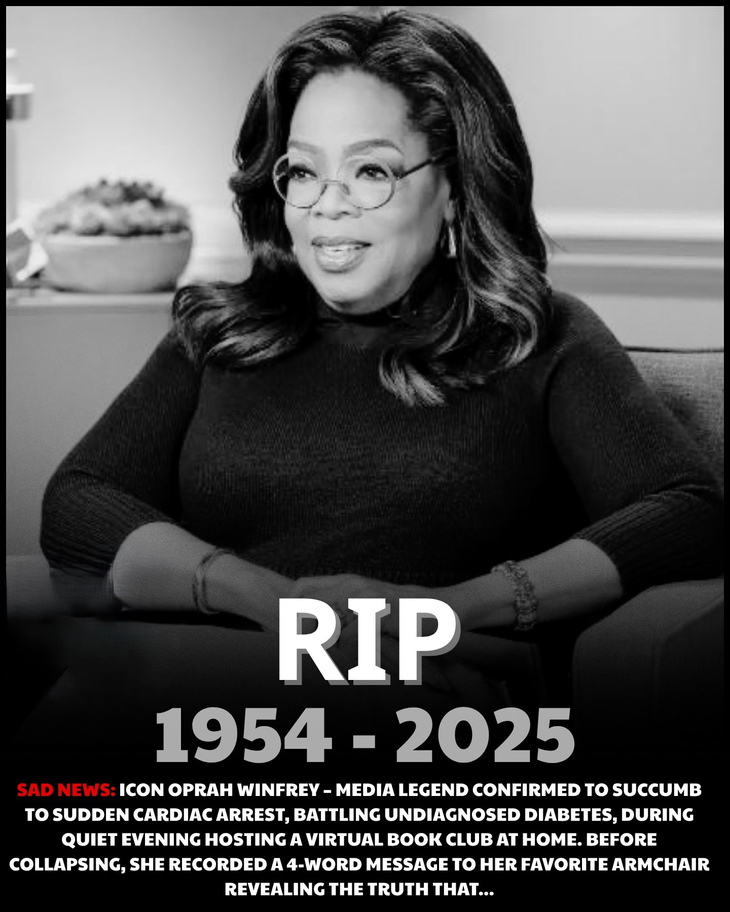 The world is in mourning following the heartbreaking news that Oprah Winfrey, the unparalleled media titan and beacon of inspiration, has passed away at the age of 71. On the evening of October 16, 2025, the beloved icon succumbed to a sudden cardiac arrest while hosting a virtual session of her renowned Oprah’s Book Club from her Montecito home. Unbeknownst to many, Oprah had been privately battling undiagnosed diabetes, a silent condition that tragically led to her untimely demise. In her final moments, she recorded a cryptic 4-word message directed to her favorite armchair—a symbol of her intimate conversations with millions—leaving behind a mystery that has left fans and loved ones reeling.